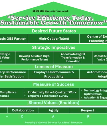 SEDC Global Business Services Sdn Bhd (SEDC GBS) komited untuk menyediakan perkhidmatan nasihat pakar melalui pusat perkhidmatan bersama yang berpusat. Kepakaran kami dalam Pengurusan Perkhidmatan, Kewangan, Sumber Manusia, dan Perolehan direka untuk meningkatkan kecekapan operasi dan tadbir urus. Matlamat kami adalah untuk memperkasakan organisasi dengan memperkemas proses agar perniagaan dapat memberi tumpuan kepada objektif teras mereka.